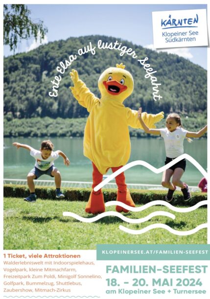 Vom 18. bis zum 20. Mai 2024 lädt der Tourismusverband St. Kanzian am Klopeiner See Familien und Besucher herzlich ein, gemeinsam mit Ente Elsa auf eine lustige Seefahrt zu gehen. Mit nur einem Ticket können Gäste drei Tage lang von 10:00 bis 18:00 Uhr eine Vielzahl von Top-Attraktionen rund um den Klopeiner See und Turnersee erleben.